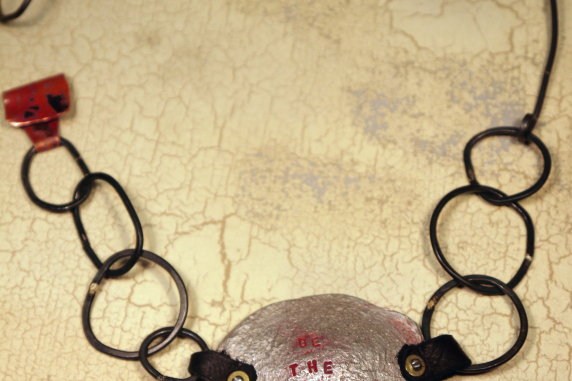 The red stamped pewter medallion was cast from a piece of ancient Roman glass. Connected with leather scraps and brass micro screws, it's attached to a steel forged chain which was soldered using silver solder. The closure is copper. The removable necklace chain is also steel which has been sealed with wax.
